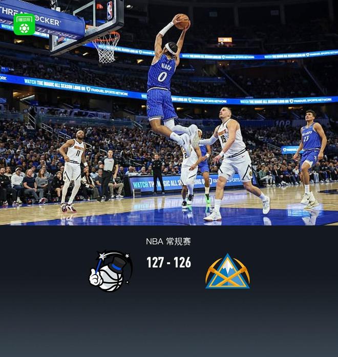 北京时间12月28日进行的NBA常规赛中,奥兰多魔术队对阵丹佛掘金队。半场魔术48-62领先掘金,最终魔术127-126领先掘金。奥兰多魔术队布莱克得到38分、6个篮板和5次助攻,贝恩得到24分、1个篮板和6次助攻;丹佛掘金队约基奇得到34分、21个篮板和12次助攻,贾马尔·穆雷得到24分、5个篮板和3次助攻。穆雷压哨绝杀不中。首节魔术师布雷克拿下15分,掘金队贾马尔穆雷拿下12分。首节战罢,魔术队以23-31落后掘金队。第二节,魔术队的贾马尔·凯恩拿下7分,掘金队的约基奇拿下9分。半场结束,魔术队以48-62落后掘金队。第三节,魔术队的温德尔·卡特得到13分,掘金队的斯宾塞·琼斯得到9分。第三节结束,魔术队以84-93落后。掘金第四节魔术贝恩拿下15分,努约基奇拿下13分。最终,魔术队以127-126击败掘金队。奥兰多魔术黑全场数据:38分6篮板5助攻2抢断,贝恩2分4分1篮板6助攻,温德尔卡特18分7篮板4助攻;丹佛掘金队约基奇得到34分、21个篮板、12次助攻和1次抢断,贾马尔·穆雷得到24分、5个篮板和3次助攻,小蒂姆·哈达威得到20分、4个篮板和2次助攻。奥兰多魔术队首发阵容:布雷克、贝恩、温德尔·卡特、本奎罗、泰勒斯·琼斯;丹佛掘金队:约基奇、贾马尔·穆雷、小蒂姆·哈达威、沃森、斯宾塞·琼斯。